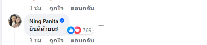 งานนี้ ชาวเน็คทั้งหลายต่างเข้ามาแสดงความยินดีด้วยกันจำนวนมาก และหนึ่งในนั้นมีดาราชื่อดัง อย่าง หนิง ปณิตา ก็ได้คอมเมนต์ด้วยบอกว่า ยินดีด้วยนะ ชาวก็กระหน่ำไลค์กันรัวๆเลย
