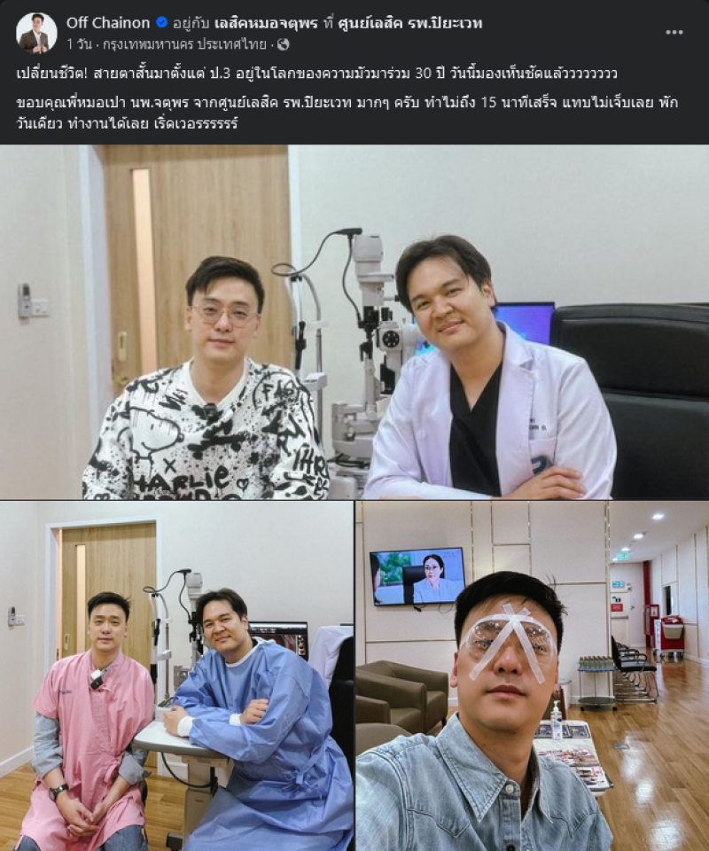 ล่าสุดทางด้าน อ๊อฟ ชัยนนท์ โพสต์ว่า เปลี่ยนชีวิต สายตาสั้นมาตั้งแต่ ป.3 อยู่ในโลกของความมัวมาร่วม 30 ปี วันนี้มองเห็นชัดแล้ววววว ขอบคุณพี่หมอเปา ทำไม่ถึง 15 นาทีเสร็จ แทบไม่เจ็บเลย พักวันเดียว ทำงานได้เลย เริ่ดเวอรรรรรร์