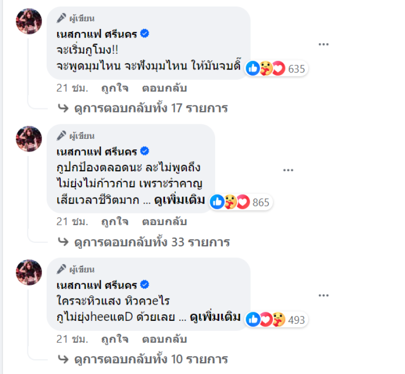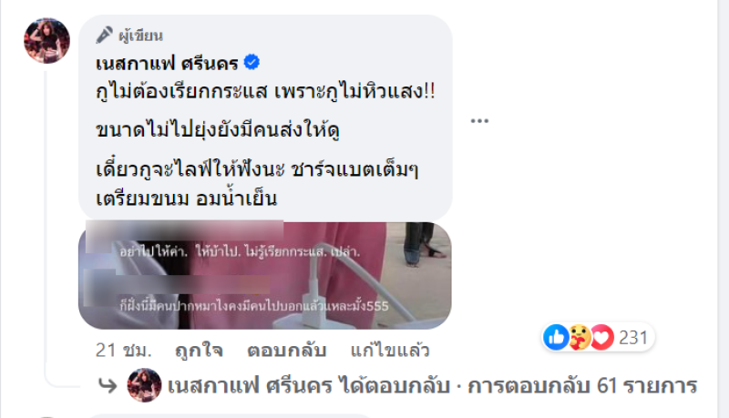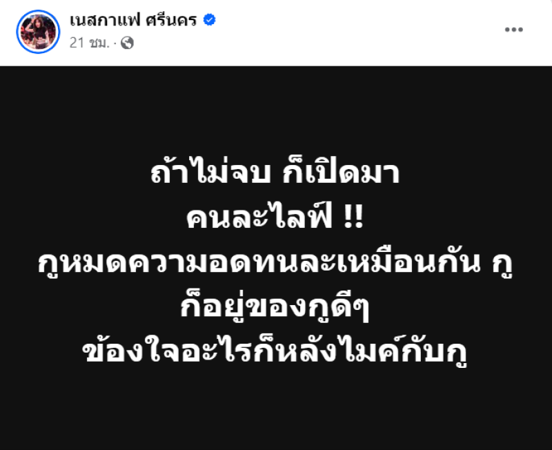 เรียกได้ว่า เป็นอีกหนึ่งนักร้องลูกทุ่งสาว อย่าง เนสกาแฟ ศรีนคร ที่หลายคนรู้จักในเพลงที่ดังๆเยอะมาก ล่าสุด เจ้าตัวได้ออกมาโพสต์ฟาดถึงใครกัน โดยได้ระบุข้อความว่า ถ้าไม่จบ ก็เปิดมา คนละไลฟ์ !! กูรหมดความอดทนละเหมือนกัน กูก็อยู่ของกูรดีๆ ข้องใจอะไรก็หลังไมค์กับกูร