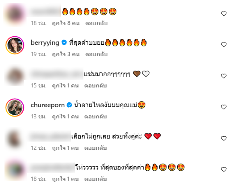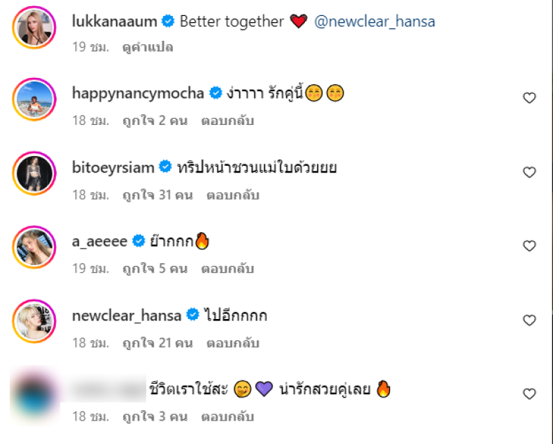 ท่ามกลาง เหล่าดาราและแฟนๆเข้ามาคอมเมนต์กันจำนวนมาก อาทิ ง่าาาา รักคู่นี้,ทริปหน้าชวนแม่ใบด้วยยย,ชีวิตเราใช้สะ น่ารักสวยคู่เลย,น้ำลายไหลงับบบคุณแม่,แซ่บมากกๆๆๆๆๆๆ ,ขาดตากล้องแล้วววววววว เป็นต้น