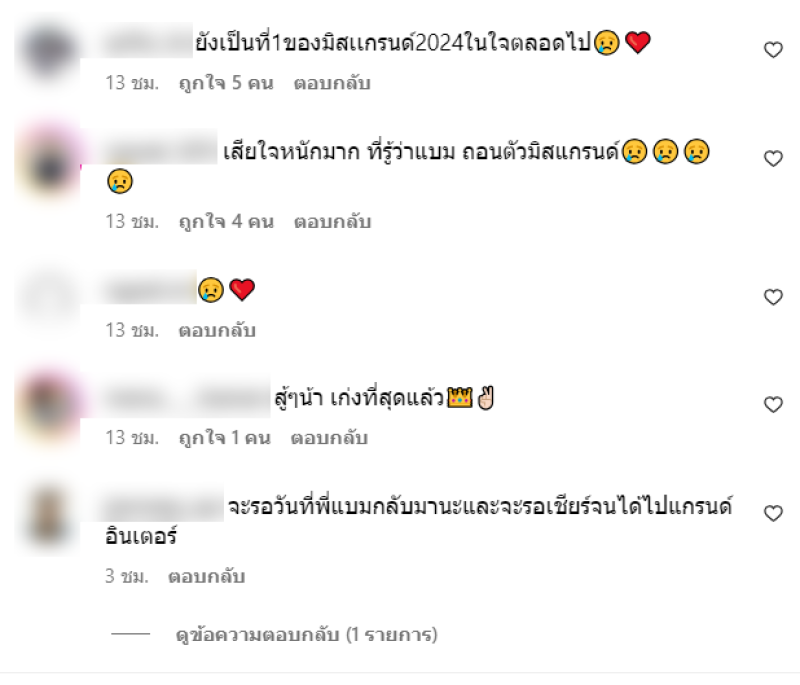ด้าน บอส ณวัฒน์ ได้ทําการไลฟ์สดขายของ และได้ตอบถึงเรื่องนี้ว่า ไม่ได้ปลด แต่น้องฃอยุติ ไม่ ได้ปลด สิ่งหนึ่งที่บอกได้เกี่ยวกับ แบม คือ ไม่ได้ปลด น้องมีความจําเป็นที่ไม่สามารถไปต่อได้ เราไม่ได้สั่งปลดมิสแกรนด์ระนอง PD ก็ไม่ได้สั่งปลด แต่น้องไม่สามารถไปต่อได้ ด้วย เหตุผลจําเป็น เราได้ผ่านขั้นตอนคุยกันมาประมาณ 10 วันแล้ว ทุกคนก็คงเสียดาย เรา และ PD ก็เสียดาย ก็รู้สึกตกใจ ก็ค่อนข้างมีแฟนคลับค่อนข้างเยอะ เขาก็มีการโปรโมตตัวเอง มี การสร้างค้อมไปค่อนข้างเยอะแล้ว และได้มาร่วมกิจกรรมกันหลายกิจกรรมแล้ว น้องก็ไม่ ได้มีปัญหาเกเร เราก็พยายามเข้าใจ