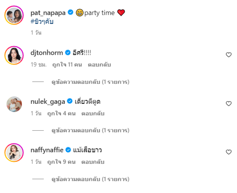 ท่ามกลาง แฟนคลับเข้ามาคอมเมนต์กันกันจำนวนมาก เช่น แซ่บสุดดแม่,ชอบหุ่นแม่แพท จังค่ะ ,สวยเซ็กซี่แซ่บมากกก,แม่แซ่บมากกกค่ะ,หุ่นสับมาก แม่ เป็นต้น