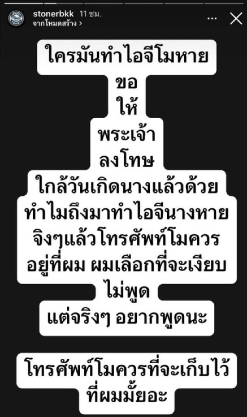 และในไอจีอินสตาแกรมยังได้โพสต์อีกว่า Ig ของโมหายไปไหนอะ ! อีกหนึ่งโพสต์ที่บอกว่า ใครทําไอจีโมหาย ขอให้พระเจ้าลงโทษ ใกล้วันเกิดนางแล้วด้วย ทําไมถึงมาทําไอจีนางหาย จริงๆ แล้วโทรศัพท์โมควรอยู่ที่ผม ผม เลือกที่จะเงียบไม่พูด แต่จริงๆ อยากพูดนะ โทรศัพท์โมควรที่จะเก็บไว้ที่ผมมั้ยอะ