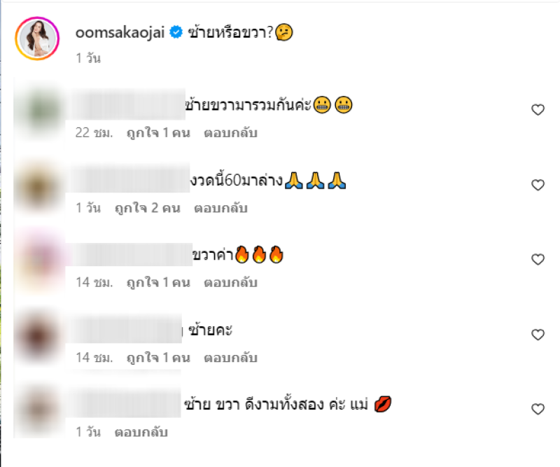 ล่าสุด อ๋อม สกาวใจ ได้โพสต์รูปคู่กับรถ พร้อมระบุแคปขั่นสั้นๆว่า ซ้ายหรือขวา งานนี้คอหวยเป็นอันรู้กัน แห่คอมเมนต์สนั่น 60-19-06-91 นั่นเอง