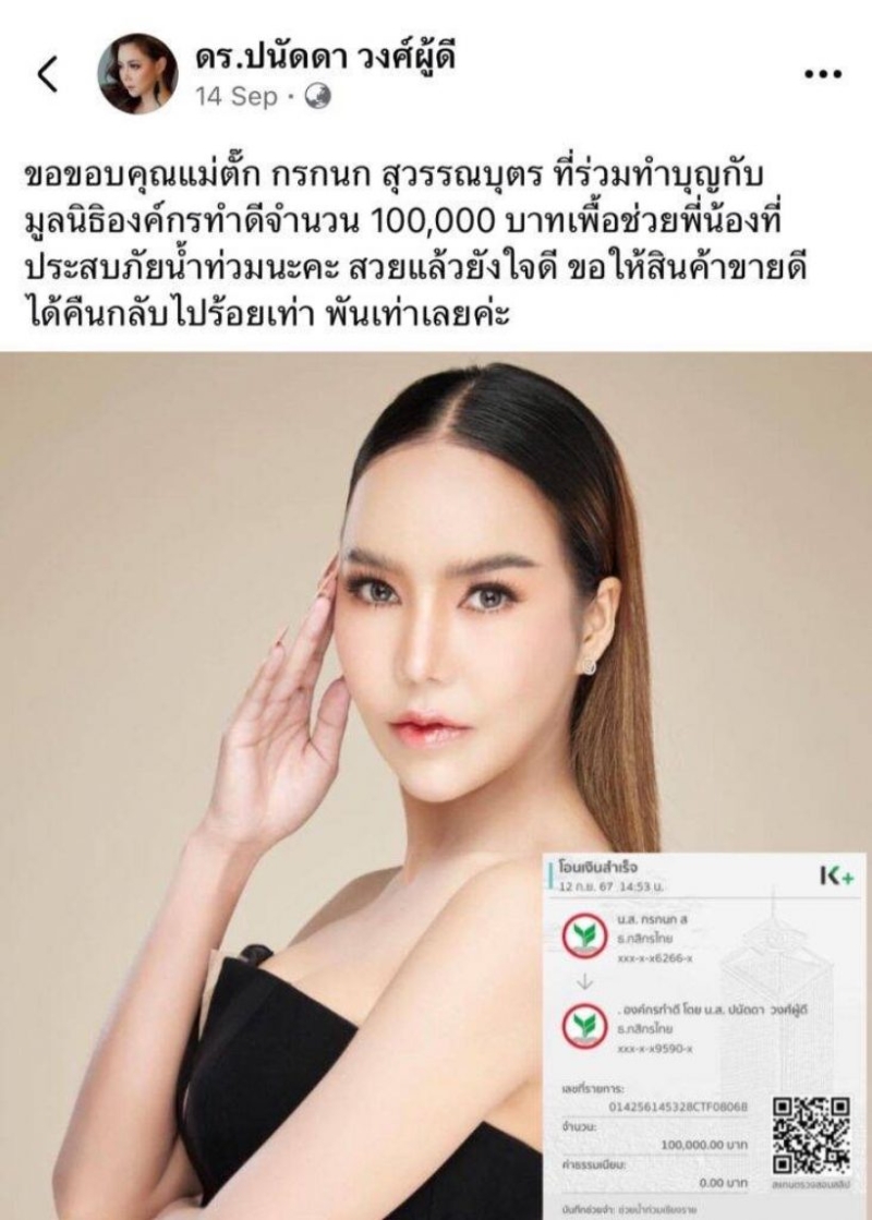 ล่าสุด บุ๋ม ปนัดดา ในฐานะประธานมูลนิธิองค์กรทำดี ได้เปิดใจผ่านไนน์เอ็นเตอร์เทน หลังแม่ตั๊กเคยบริจาคช่วยน้ำท่วม 100,000 บาท โดยบอกว่า สำหรับตนมองว่าด้วยเจตนาอาจจะไม่โดน โดยปกติจะไม่ทราบว่าเงินที่คนนำมาบริจาคได้มาจากไหน สบายใจได้ ไม่ได้เป็นการฟอกเงิน ทางองค์กรได้นำเงินทั้งหมดไปช่วยเหลือผู้ประสบภัยจริงๆ หากตำรวจเรียกไปสอบ ยินดีที่จะไปชี้แจงข้อเท็จจริง หากต้องการเงินคืนก็สามารถทำตามขั้นตอนกฎหมายได้ ไม่ได้ซีเรียส