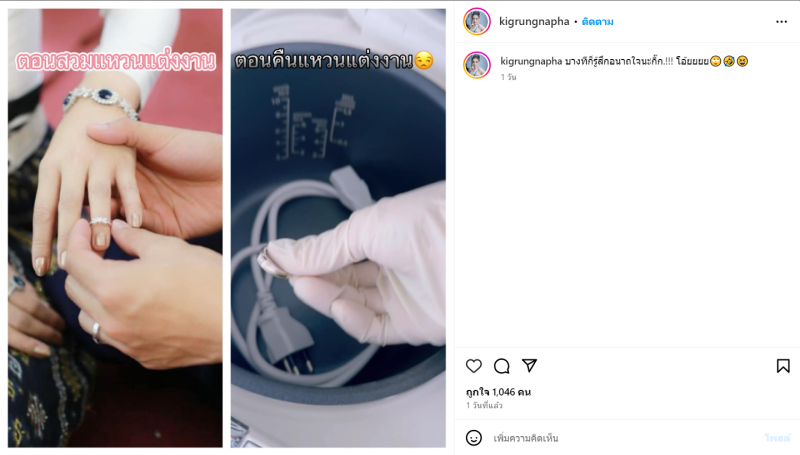 ล่าสุด กิ๊กได้เผยคลิปที่เข้าไปเก็บของที่คอนโดผ่านทาง TikTok @kig_rungnapha พร้อมระบุแปคชั่นว่า อยากเจอก็ออกมาเจอค่ะ ก่อนนี้เห็นบอก อยากคุยกันเราสามคน ก็มาดิ หรือรอไปคุยที่ศาล นอกจากนี้ สาวกิ๊กเอง ยังได้เผยผ่านทางอินสตาแกรมส่วนตัวด้วย เป็นภาพที่เอาแหวนมาเปรียบเทียบกัน ตอยแต่งงานและตอนที่คืนของกัน ซึ่งอยู่ในหม้อหุงข้าว พร้อมระบุแคปชั่นว่า บางทีก็รู้สึกอนาถใจนะกิ๊ก.!!! โอ้ยยยย