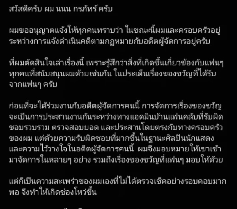 สวัสดีครับ ผม นนน กรภัทร์ ครับ ผมขออนุญาตแจ้งให้ทุกคนทราบว่า ในขณะนี้ผมและครอบครัวอยู่ระหว่างการแจ้งดำเนินคดีตามกฎหมายกับอดีตผู้จัดการอยู่ครับ ที่ผมตัดสินใจเล่าเรื่องนี้ เพราะรู้สึกว่าสิ่งที่เกิดขึ้นเกี่ยวข้องกับแฟน ๆ ทุกคนที่สนับสนุนผมด้วยเช่นกัน ในประเด็นเรื่องของขวัญที่ได้รับจากแฟน ๆ ครับ