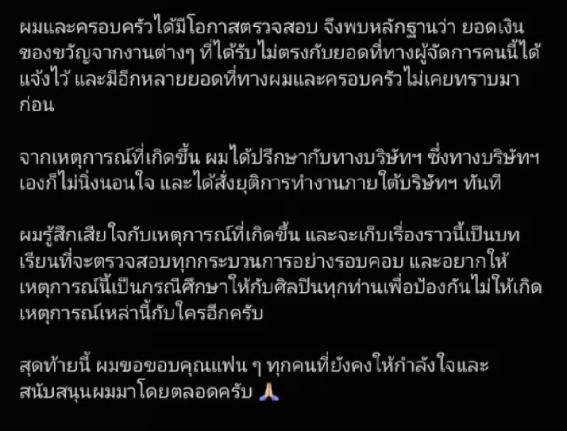 ผมรู้สึกเสียใจกับเหตุการณ์ที่เกิดขึ้น และจะเก็บเรื่องราวนี้เป็นบทเรียนที่จะตรวจสอบทุกกระบวนการอย่างรอบคอบ และอยากให้เหตุการณ์นี้เป็นกรณีศึกษาให้กับศิลปินทุกท่าน เพื่อป้องกันไม่ให้เกิดเหตุการณ์เหล่านี้กับใครอีกครับ สุดท้ายนี้ ผมขอขอบคุณแฟน ๆ ทุกคนที่ยังคงให้กำลังใจ และสนับสนุนผมมาโดยตลอดครับ
