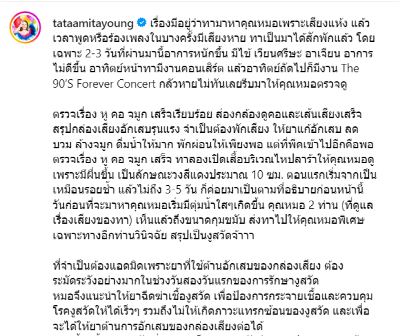 เรียกได้ว่า เป็นนักร้องยุค90 สำหรับ ทาทา ยัง ที่มีผลงานในวงการมามากมาย ล่าสุด เจ้าตัวออกมาเผยว่ากำลังนอนรักษาตัวอยู่ที่โรงพยาบาล โดยได้เล่าอาการผ่านทางอินสตาแกรมส่วนตัวว่า เรื่องมีอยู่ว่าทามาหาคุณหมอเพราะเสียงแห้ง แล้วเวลาพูดหรือร้องเพลงในบางครั้งมีเสียงหาย ทาเป็นมาได้สักพักแล้ว โดยเฉพาะ 2-3 วันที่ผ่านมานี้อาการหนักขึ้น มีไข้ เวียนศรีษะ อาเจียน อาการไม่ดีขึ้น อาทิตย์หน้าทามีงานคอนเสิร์ต แล้วอาทิตย์ถัดไปก็มีงาน The 90’S Forever Concert กลัวหายไม่ทันเลยรีบมาให้คุณหมอตรวจดู