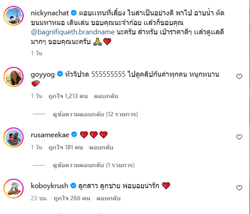 เรียกได้ว่า เป็นอีกคู่ที่จบกันได้แบบดี และยังเป็นพี่น้องกัยน อย่าง นิกกี้ ณฉัตร และ ก้อย อรัชพร ที่ทั้งคู่นั้นได้เลิกกันไปเมื่อปี2566 นั่นเอง ล่าสุดทางนิกกี้ ได้เผยภาพคู่กันอีกครั้ง หลังเลิกรากันไปผ่านทางอินสตาแกรม พร้อมระบุข้อความว่า ตอบเเทนที่เลี้ยง ไนล่าเป็นอย่างดี พาไป อาบน้ำ ตัดขนมหาหมอ เดินเล่น ขอบคุณนะจ้าก้อย เเล้วก็ขอบคุณ @bagnifiqueth.brandname นะครับ สำหรับ เป๋าราคาดีๆ เเล้วดูเเลดีมากๆ ขอบคุณนะครับ