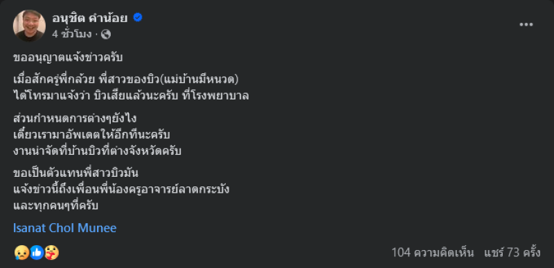 เรียกได้ว่าเป็นอีกหนึ่งเซเลบริตี้ชื่อดังสำหรับ บิว อิษณัฐ ชลมูณี หรือที่หลายคนรู้จักเธอในชื่อ แม่บ้านมีหนวด ที่ล่าสุดเฟซบุ๊ค อนุชิต คำน้อย ได้โพสต์แจ้งข่าวเศร้าให้กับแฟนๆได้ทราบว่า