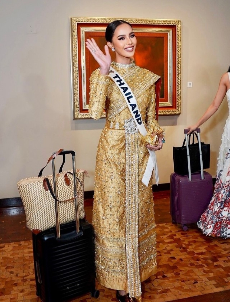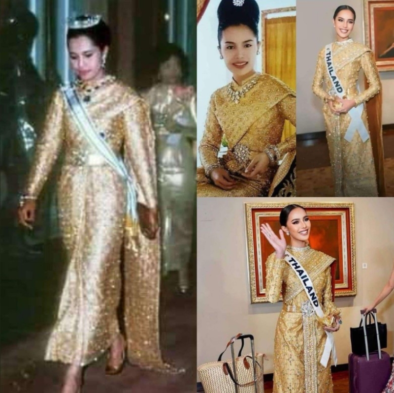 โดยครั้งนี้ผู้ออกแบบจัดทำตัวชุดได้รับแรงบรรดาลใจจากฉลองพระองค์ไทยศิวาลัย ตัดจากผ้ายกดอก ทอสลับไหมทองลายพุ่มละเอียดข้าวหลามตัด ประกอบลายก้านแย่ง