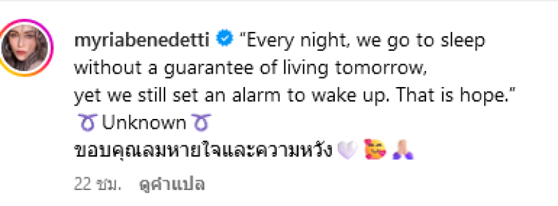 ล่าสุด นัท มีเรีย ได้โพสต์ข้อความผ่าน อินสตาแกรม ส่วนตัวเขียนแคปชั่นว่า Every night, we go to sleep without a guarantee of living tomorrow, yet we still set an alarm to wake up. That is hope. Unknown ขอบคุณลมหายใจและความหวัง ท่ามกลางแฟนๆเพื่อนในวงการต่างคอมเมนต์ส่งกำลังใจกันอย่างมาก รวมถึงนางเอกอย่าง แอฟ ทักษอร ได้เข้ามาส่งหัวใจอีกด้วย
