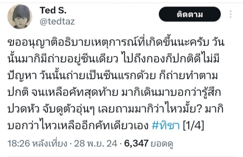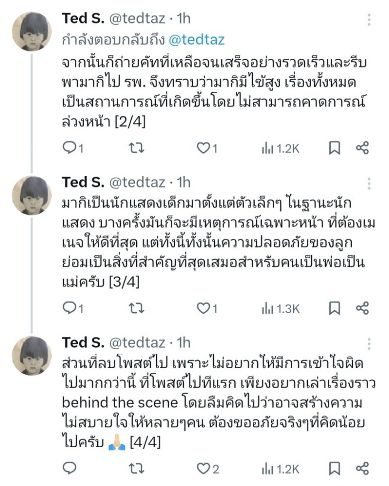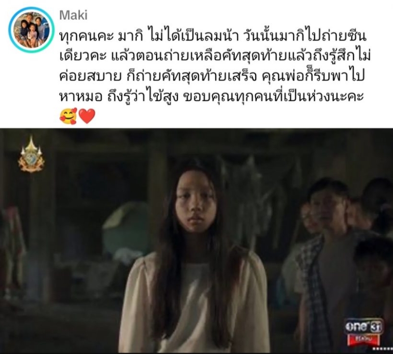 ล่าสุดทาง คุณพ่อ ได้อธิบายสิ่งที่เกิดขึ้นเพิ่มเติมก่อนดรามาลุกลามไปไกลกว่านี่ โดยระบุว่า ขออนุญาติอธิบายเหตุการณ์ที่เกิดขึ้นนะครับ วันนั้นมากิมีถ่ายอยู่ซีนเดียว ไปถึงกองก็ปกติดีไม่มีปัญหา วันนั้นถ่ายเป็นซีนแรกด้วย ก็ถ่ายทำตามปกติ จนเหลือคัทสุดท้าย มากิเดินมาบอกว่ารู้สึกปวดหัว จับดูตัวอุ่นๆ เลยถามมากิว่าไหวมั้ย? มากิบอกว่าไหวเหลืออีกคัทเดียวเอง