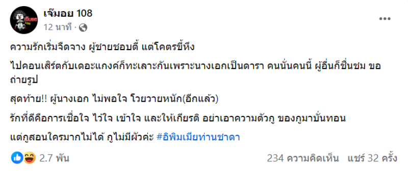วันที่ 15 ก.พ. 67 ด้านเพจดัง อย่าง เจ๊มอย 108 ได้ออกมาเผยประเด็นร้อนเดือนอีกครั้ง โดยได้ระบุข้อความว่า ความรักเริ่มจืดจาง ผู้ชายชอบตี้ แต่โคตรขี้หึง ไปคอนเสิร์ตกับเดอะแกงค์ก็ทะเลาะกันเพราะนางเอกเป็นดารา คนนั่นคนนี้ ผู้อื่นก็ชื่นชม ขอถ่ายรูป