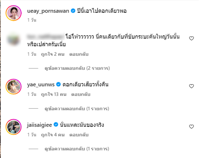 ท่ามกลาง เพื่อนๆในวงการและชาวเน็ตเข้ามาคอมเมนต์กันจำนวนมาก อาทิ นั่นแหละมันของจริง,ว้าวซ่า เครเลอ แล้วใครจะสู้ไหว,โอเค กินเรียบ,หุ่นลูกรักบีกิน,Happy Valentine's Day ค่าแม่,สวยแซ่บอีกแล้ว เป็นต้น