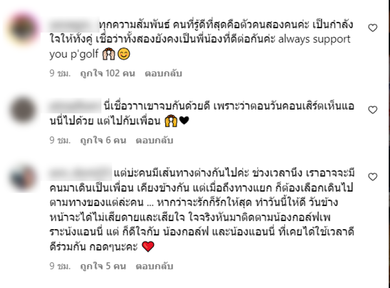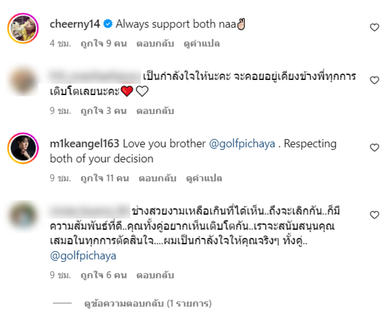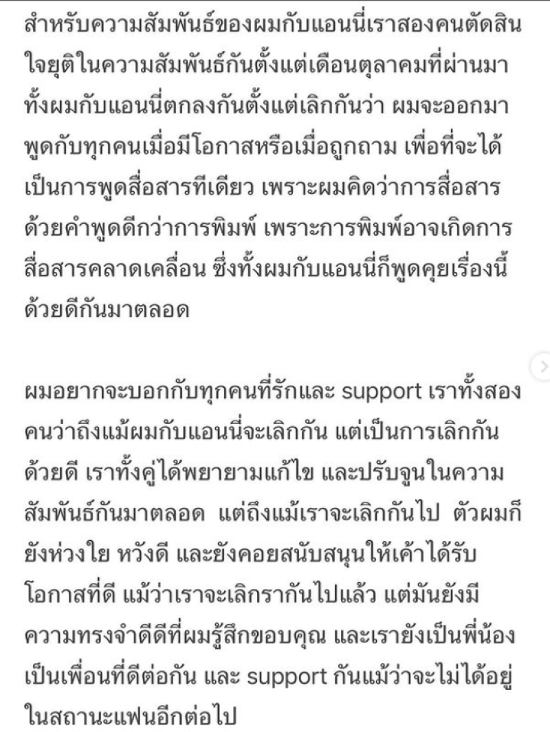 ผมอยากจะบอกกับทุกคนที่รักและ support เราทั้งสอง คนว่าถึงแม้ผมกับแอนนี่จะเลิกกัน แต่เป็นการเลิกกัน ด้วยดี เราทั้งคู่ได้พยายามแก้ไข และปรับจูนในความ สัมพันธ์กันมาตลอด แต่ถึงแม้เราจะเลิกกันไป ตัวผมก็ ยังห่วงใย หวังดี และยังคอยสนับสนุนให้เค้าได้รับ โอกาสที่ดี แม้ว่าเราจะเลิกรากันไปแล้ว แต่มันยังมี ความทรงจําดีดีที่ผมรู้สึกขอบคุณ และเรายังเป็นพี่น้อง เป็นเพื่อนที่ดีต่อกัน และ support กันแม้ว่าจะไม่ได้อยู่ ในสถานะแฟนอีกต่อไป