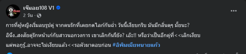 เรียกได้ว่ามีเรื่องราวของวงการบันเทิงมาให้ชาวเน็ตได้ตามสืบส่งท้ายปีเลยทีเดียวเมื่อทางด้านเพจ เจ๊มอย108 V1 ได้โพสต์ข้อความความรักของคู่รักหน้าเก๋ ส่อแววเลิกกันหรือเปล่านะ?? เพราะรูปคู่หายไปเพียบเลย โดยระบุข้อความว่า