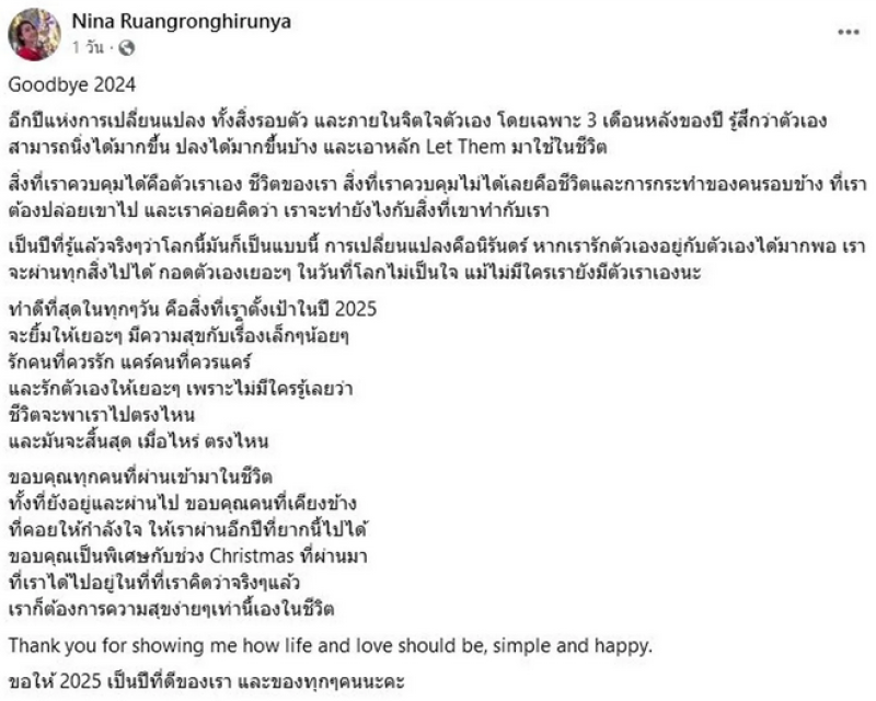 โดยโพสต์ว่า Goodbye 2024 อีกปีแห่งการเปลี่ยนแปลง ทั้งสิ่งรอบตัว และภายในจิตใจตัวเอง โดยเฉพาะ 3 เดือนหลังของปี รู้สึกว่าตัวเองสามารถนิ่งได้มากขึ้น ปลงได้มากขึ้นบ้าง และเอาหลัก Let Them มาใช้ในชีวิต สิ่งที่เราควบคุมได้คือตัวเราเอง ชีวิตของเรา สิ่งที่เราควบคุมไม่ได้เลยคือชีวิตและการกระทำของคนรอบข้าง ที่เราต้องปล่อยเขาไป และเราค่อยคิดว่า เราจะทำยังไงกับสิ่งที่เขาทำกับเรา เป็นปีที่รู้แล้วจริงๆ ว่าโลกนี้มันก็เป็นแบบนี้ การเปลี่ยนแปลงคือนิรันดร์ หากเรารักตัวเองอยู่กับตัวเองได้มากพอ เราจะผ่านทุกสิ่งไปได้ กอดตัวเองเยอะๆ ในวันที่โลกไม่เป็นใจ แม้ไม่มีใคร เรายังมีตัวเราเองนะ