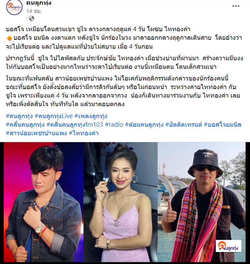 จากกรณีที่ เพจดัง อย่าง คนลูกทุ่ง ได้ออกมาเผยประเด็น ชูใจ หรือ แคท กัลยาณี อดีต สาวน้อยเพชรบ้านแพง โดยได้เผยว่า ชูใจ นักร้องในวง มาลาออกกลางฤดูกาลเดินสาย โดยอ้างว่าจะไปเรียนต่อ และไปดูแลแม่ที่ป่วยไม่สบาย เมื่อ 4 วันก่อน ปรากฏวันที่ 16 ก.พ. 67 ที่ผ่านมา ชูใจ ไปไลฟ์สดกับ ประจักษ์ชัย ไหทองคำ เมื่อช่วงบ่ายที่ผ่านมา สร้างความมึนงง ให้กับบอสโจเป็นอย่างมากไหนว่าจะลาไปเรียนต่อ งานนี้เหมือนตน โดนเด็กสวมเขา