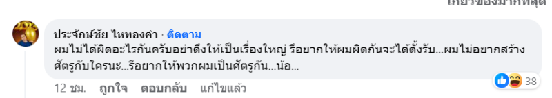 โดยทาง นายประจักษ์ชัยก็ได้เข้ามาคอมเมนต์ในเพจดังว่า ผมไม่ได้ผิดอะไรกันครับอย่าดึงให้เป็นเรื่องใหญ่ รึอยากให้ผมผิดกันจะได้ตั้งรับ...ผมไม่อยากสร้างศัตรูกับใครนะ...รึอยากให้พวกผมเป็นศัตรูกัน...น้อ.. ล่าสุด ก็ได้โพสต์ผ่านทางfacebook ของตัวเอง และได้บอกว่า #ต่างคนต่างทำมาหากินครับ อย่าดราม่าสร้างกระเเสยึดพื้นที่สื่อ เอามวลชนเเยกฝ่าย ฮักกันไว้ดีกว่าซังกัน ครับ...อย่าเยอะ