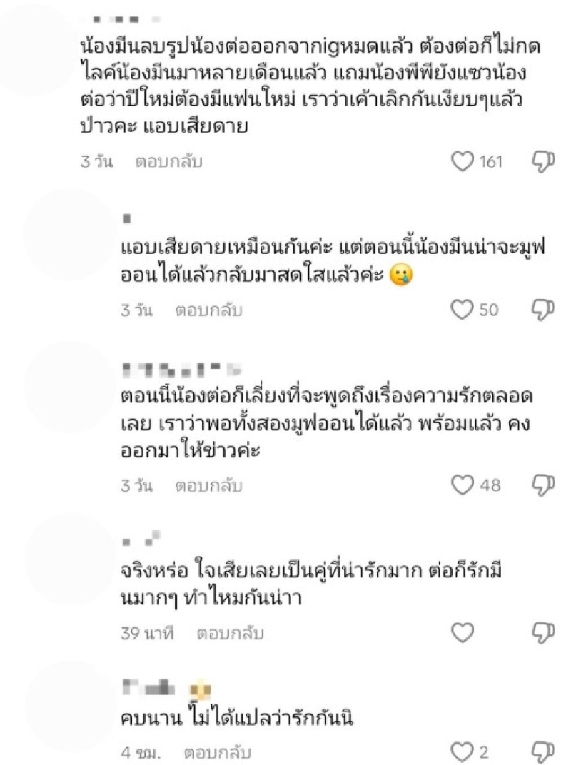 ต่อ ธนภพ เลิกกับแฟนนอกวงการแล้วเหรอ?, น้องมีนลบรูปน้องต่อออกจาก ig หมดแล้ว น้องต่อก็ไม่กดไลก์น้องมีนมาหลายเดือนแล้ว แถมน้องพีพียังแซวน้องต่อว่า ปีใหม่ต้องมีแฟนใหม่ เราว่าเค้าเลิกกันเงียบๆ แล้วเปล่าคะ แอบเสียดาย, คุณกับต่อ ธนภพ ยังมีความสุขอยู่ไหม? สุขสันต์วันคริสต์มาส รักและอยู่เคียงข้างต่อตลอดไป