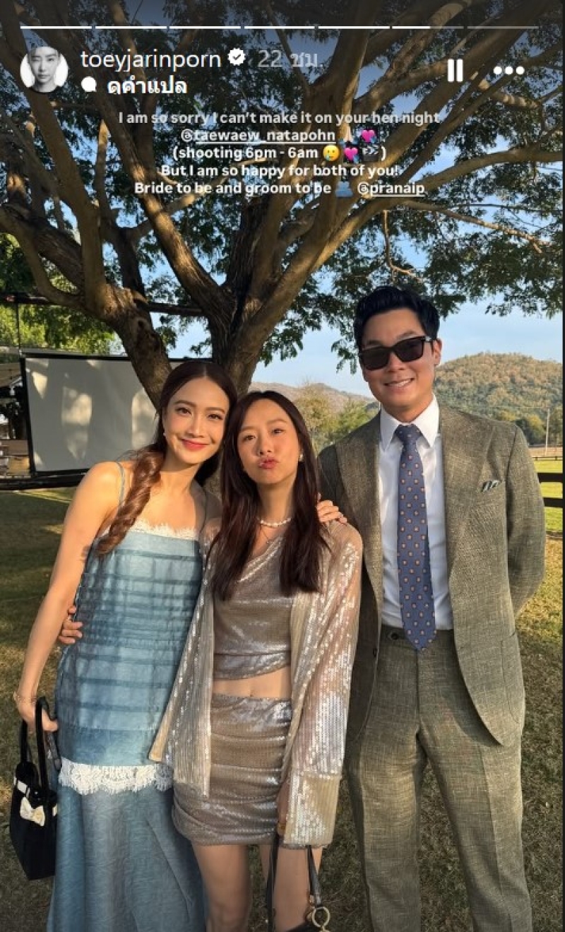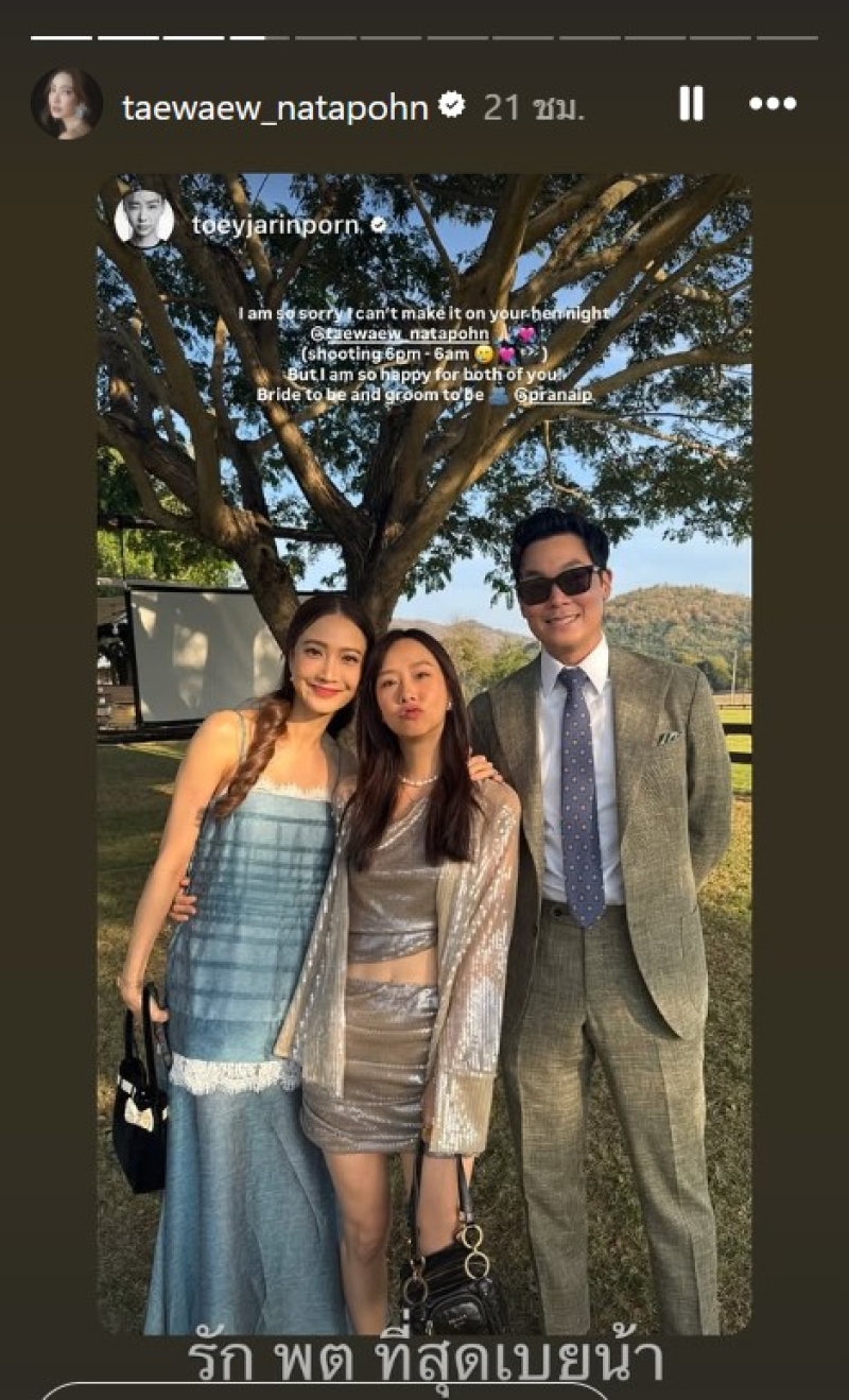 ล่าสุด ทางเต้ยได้โพสต์รูปคู่กับ แต้วและไฮโซนัย พร้อมแท็กไอจี และเผยข้อความว่า I am so sorry I can't make it on your hen night @taewaew_natapohn (shooting 6pm-6am) But I am so happy for both of you! Bride to be and groom to be @pranaip
