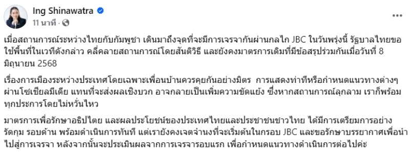 ล่าสุด ทางนายกอิ๊ง ได้เคลื่อนไหว ผ่านfacebook ว่า เมื่อสถานการณ์ระหว่างไทยกับกัมพูชา เดินมาถึงจุดที่จะมีการเจรจากันผ่านกลไก JBC ในวันพรุ่งนี้ รัฐบาลไทยขอใช้พื้นที่ในเวทีดังกล่าว คลี่คลายสถานการณ์โดยสันติวิธี และยังคงมาตรการเดิมที่มีข้อสรุปร่วมกันเมื่อวันที่ 8 มิถุนายน 2568