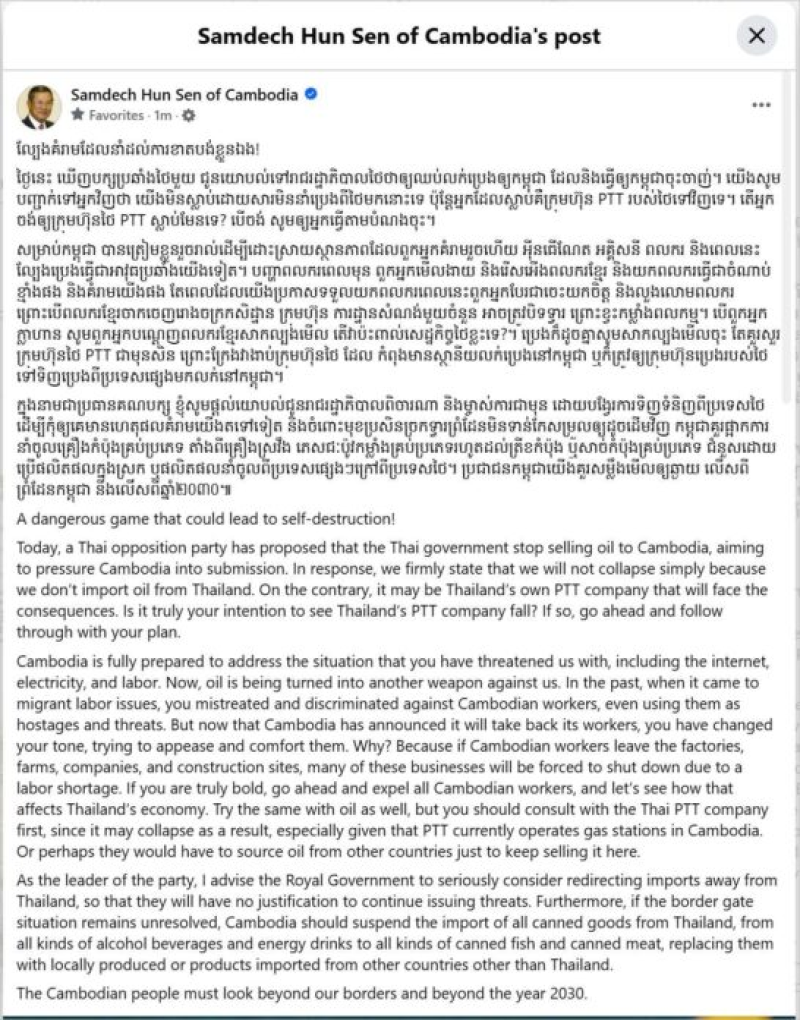 ฮุนเซน โพสต์ข้อความในเฟซบุ๊กของตัวเอง ขณะที่สถานการณ์ความขัดแย้งระหว่างไทยและกัมพูชายังดำเนินอยู่ ระบุว่า เกมอันตรายที่อาจนำไปสู่ความพินาศของตัวเอง! วันนี้ พรรคฝ่ายค้านของไทยเสนอให้รัฐบาลไทยหยุดขายน้ำมันให้กัมพูชา เพื่อกดดันให้กัมพูชายอมจำนน แต่เราขอยืนยันว่า กัมพูชาจะไม่พังทลายเพียงเพราะไม่ได้นำเข้าน้ำมันจากไทย ในทางกลับกัน บริษัท ปตท. ของไทยต่างหากที่อาจได้รับผลกระทบ คุณต้องการให้บริษัท ปตท. ของไทยล้มละลายจริงหรือ? ถ้าใช่ ก็ขอให้ดำเนินการตามแผนของคุณ