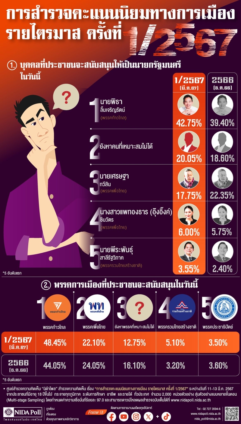 ศูนย์สำรวจความคิดเห็น นิด้าโพล สถาบันบัณฑิตพัฒนบริหารศาสตร์ (นิด้า) เปิดเผยผลการสำรวจของประชาชน เรื่อง การสำรวจคะแนนนิยมทางการเมือง รายไตรมาส ครั้งที่ 1/2567 โดยทำการสำรวจระหว่างวันที่ 11-13 มีนาคม 2567 จากประชาชนที่มีอายุ 18 ปีขึ้นไป ทั่วประเทศ รวมทั้งสิ้น จำนวน 2,000 หน่วยตัวอย่าง ทั้งนี้ เมื่อถามถึงบุคคลที่ประชาชนจะสนับสนุนให้เป็นนายกรัฐมนตรีในวันนี้