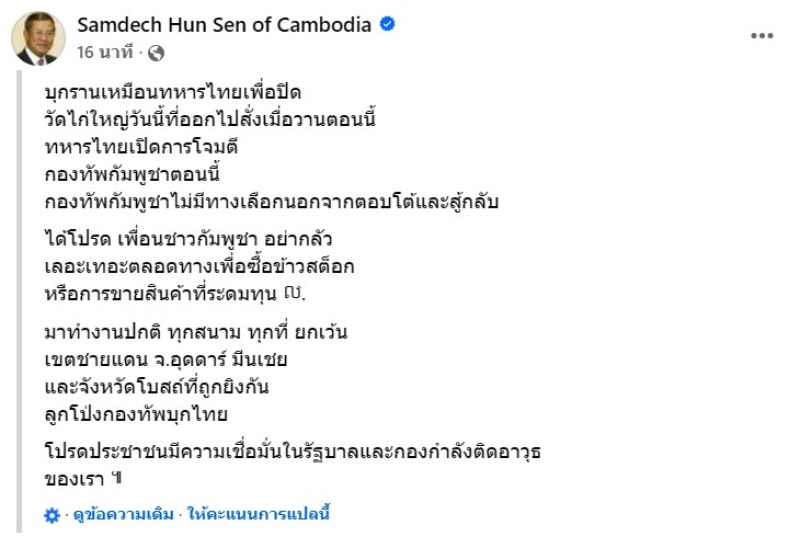 ล่าสุด ทาง ฮุนเซน ได้ออกมาโพสต์แล้วว่า บุกรานเหมือนทหารไทยเพื่อปิด วัดไก่ใหญ่วันนี้ที่ออกไปสั่งเมื่อวานตอนนี้ ทหารไทยเปิดการโจมตี กองทัพกัมพูชาตอนนี้ กองทัพกัมพูชาไม่มีทางเลือกนอกจากตอบโต้และสู้กลับ