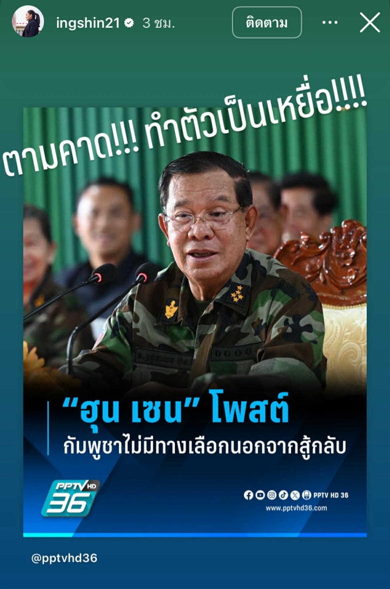 ต่อมา อีกหนึ่งโพสต์ที่ นายกอิ๊งค์ ได้แชร์ คือ คำกล่าวจาก ฮุน เซน นายกรัฐมนตรีกัมพูชา ที่บอกว่า กัมพูชาไม่มีทางเลือกนอกจากต้องตอบโต้ ซึ่ง นายกอิ๊งค์ ได้แสดงความคิดเห็นว่า ตามคาด ทำตัวเป็นเหยื่อ ซึ่งเป็นการสะท้อนถึงท่าทีของกัมพูชที่พยายามหลีกเลี่ยงความรับผิดชอบจากเหตุการณ์นี้