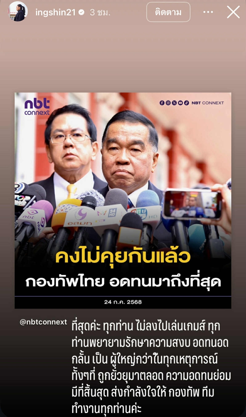 โดย โพสต์แรกของ นายกอิ๊งค์ ได้แชร์ข้อความจาก พล.อ.ณัฐพล นาคพาณิชย์ ผบ.ทบ. มีข้อความว่า คงไม่คุยกันแล้ว กองทัพไทยอดทนมาถึงที่สุด นายกอิ๊งค์ ได้เสริมไปอีกว่า ที่สุดค่ะ ทุกท่านไม่ลงไปเล่นเกมส์ ทุกท่านพยายามรักษาความสงบ อดทนอดกลั้น เป็นผู้ใหญ่ในทุกเหตุการณ์ ทั้งๆ ที่ถูกยั่วยุมาตลอด ความอดทนย่อมมีที่สิ้นสุด