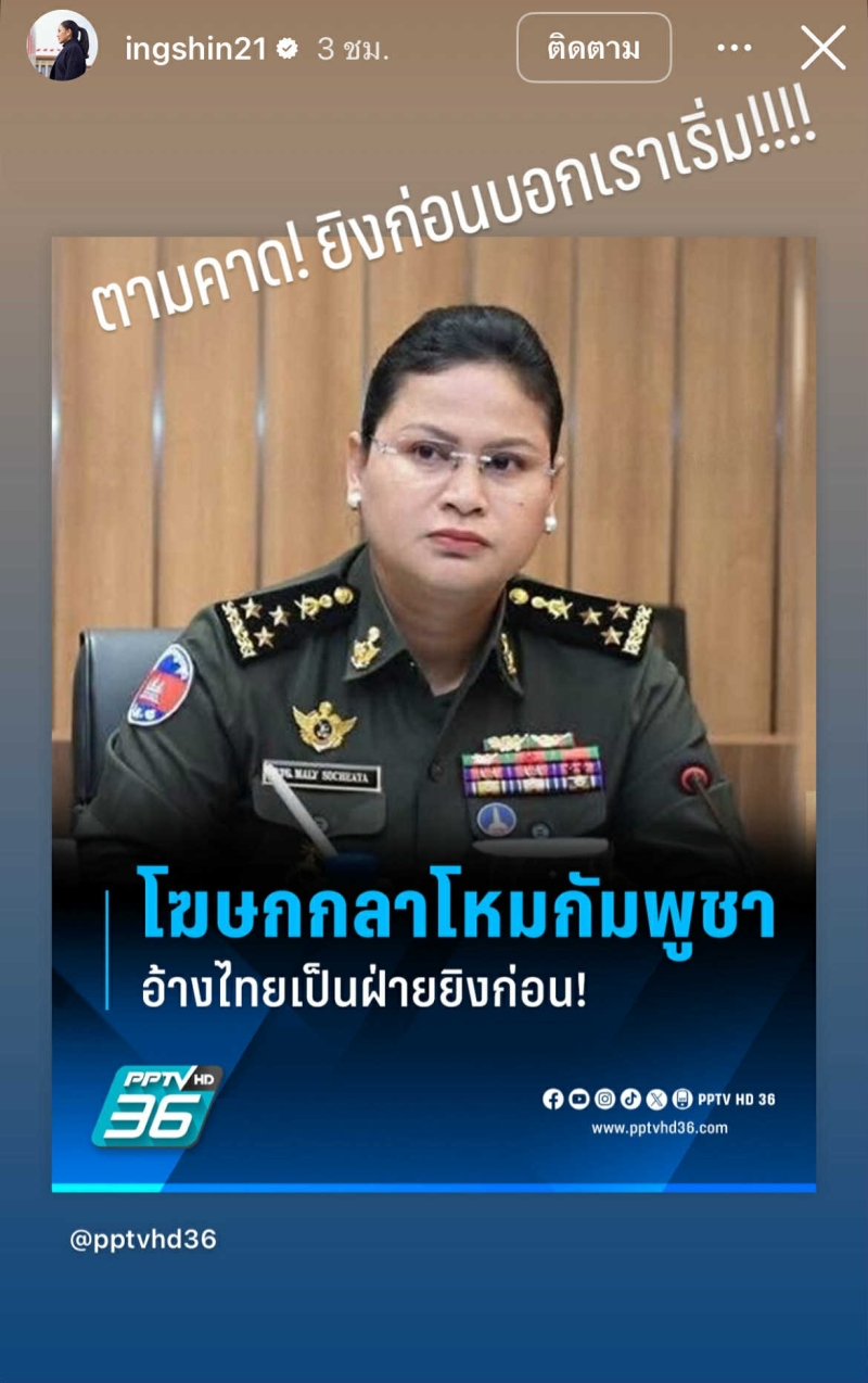 เรียกได้ว่า หลายคนคงรู้จักกันดี กับ อิ๊งค์ หรือ น.ส.แพทองธาร ชินวัตร นายกรัฐมนตรี และรัฐมนตรีกระทรวงวัฒนธรรม ได้โพสต์ข้อความผ่านอินสตาแกรม ingshin21 อย่างต่อเนื่อง หลังจากเกิดเหตุการณ์ปะทะระหว่าง กองทัพไทย และ กัมพูชา ที่เกิดขึ้นในช่วงเช้าของ วันที่ 24 กรกฎาคม 2568