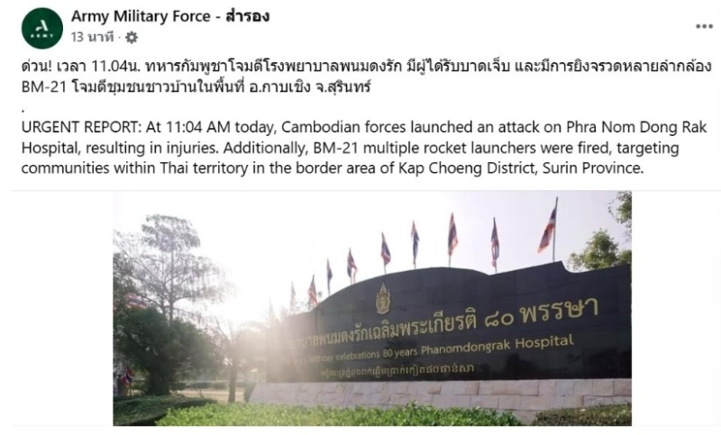 จากกรณีที่ก่อนหน้านั้น ได้มีข่าว เพจ Army Military Force-สำรอง โพสต์แจ้งว่า ทหารกัมพูชาโจมตีโรงพยาบาลพนมดงรัก จ.สุรินทร์ เวลา 11.04 น. โดยมีรายละเอียด ดังนี้ ด่วน! เวลา 11.04น. ทหารกัมพูชาโจมตีโรงพยาบาลพนมดงรัก มีผู้ได้รับบาดเจ็บ และมีการยิงจรวดหลายลำกล้อง BM-21 โจมตีชุมชนชาวบ้านในพื้นที่ อ.กาบเชิง จ.สุรินทร์