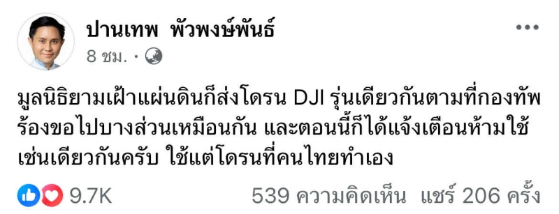 นอกจากนี้ นายปานเทพ ยังได้เน้นย้ำให้เจ้าหน้าที่ ทหาร นำโดรน DJI ออกจากพื้นที่ชายแดนทันที และหันมาใช้โดรนที่พัฒนา หรือ ผลิตในประเทศ ซึ่งปลอดภัยมากกว่าในการปฏิบัติภารกิจลาดตระเวน