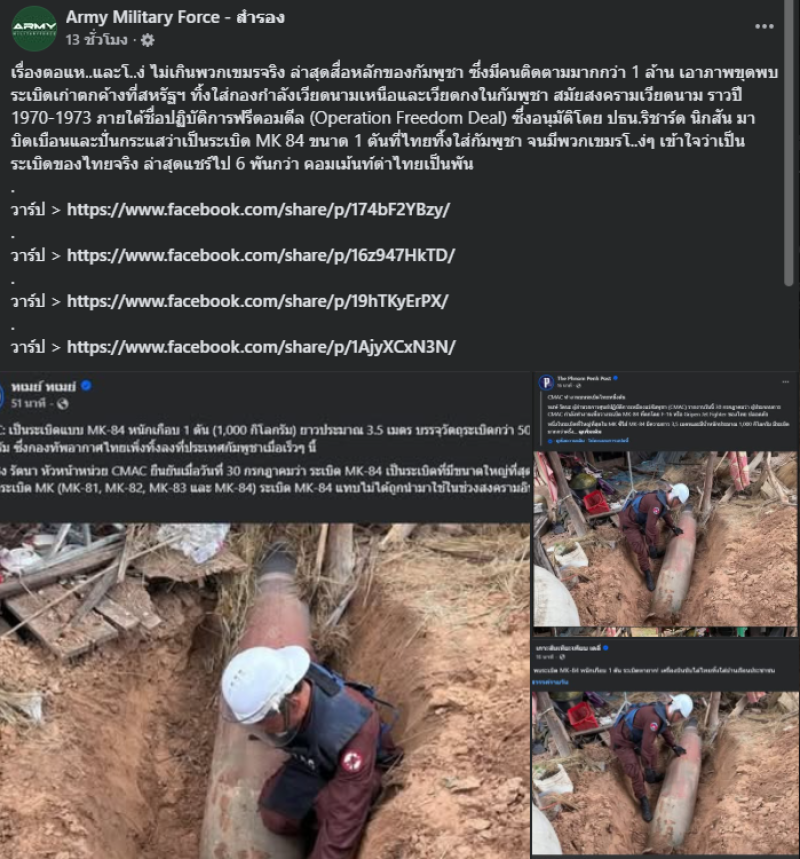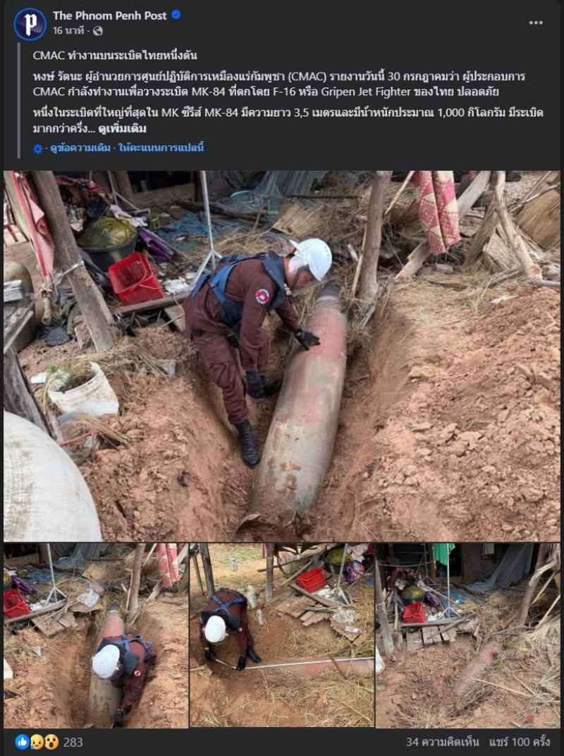 เมื่อวันที่ 30 กรกฎาคม 2565 สื่อท้องถิ่นของกัมพูชาหลายสำนัก รวมถึง ทเมย์ ทเมห์ และ พนมเปญโพสต์ รายงานคำให้สัมภาษณ์ของนายเฮง รัตนะ ผู้อำนวยการศูนย์ปฏิบัติการทุ่นระเบิดแห่งกัมพูชา (CMAC) ว่า เจ้าหน้าที่ของ CMAC กำลังจัดการกับระเบิดขนาดใหญ่รุ่น MK-84 ซึ่งเขาอ้างว่าอาจถูกทิ้งโดยเครื่องบินขับไล่ F-16 หรือกริพเพนของกองทัพอากาศไทย