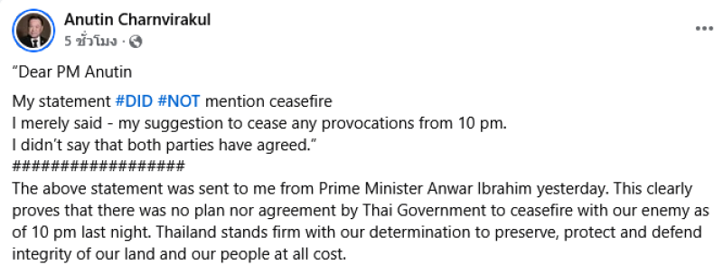 จากเหตุการณ์การปะทะระหว่างชายแดนไทย-กัมพูชานั้น ล่าสุดวันนี้ 14 ธ.ค. นายอนุทิน ชาญวีรกูล นายกฯและรมว.มหาดไทย ได้โพสต์ข้อความจาก นายอันวาร์ อิบราฮิม นายกรัฐมนตรีมาเลเซีย ระบุว่า Dear PM Anutin My statement #DID #NOT mention ceasefire I merely said - my suggestion to cease any provocations from 10 pm. I didn't say that both parties have agreed.