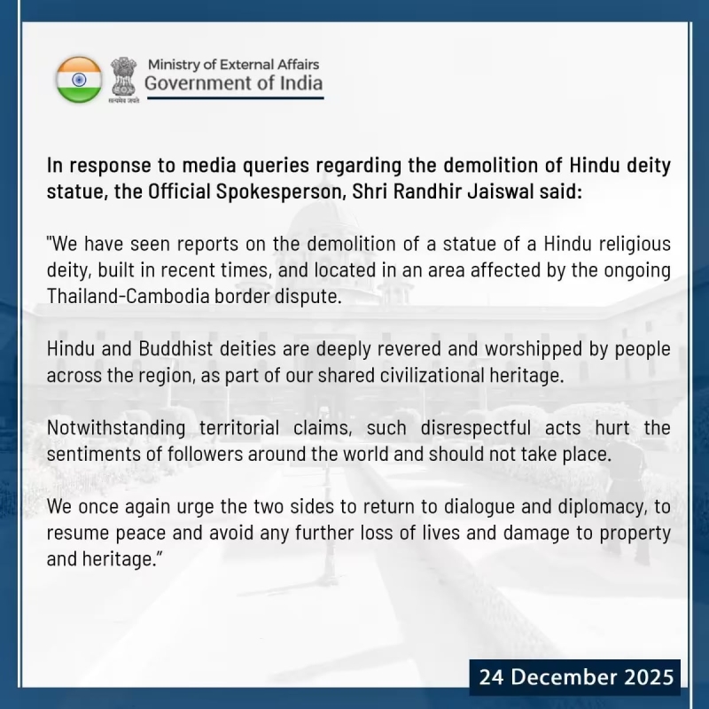 รันธีร์ ไจสวาล โฆษกกระทรวงการต่างประเทศอินเดีย ระบุในแถลงการณ์ว่า อินเดียได้รับรายงานเกี่ยวกับการทำลายรูปปั้นเทพเจ้าฮินดูซึ่งเพิ่งถูกสร้างขึ้น และตั้งอยู่ในพื้นที่ที่มีข้อพิพาทชายแดนระหว่างไทยกับกัมพูชา โดยย้ำว่าเทพเจ้าทั้งในศาสนาฮินดูและพุทธได้รับการเคารพบูชาอย่างลึกซึ้งจากประชาชนในภูมิภาคนี้ และถือเป็นส่วนหนึ่งของมรดกทางอารยธรรมร่วมกัน