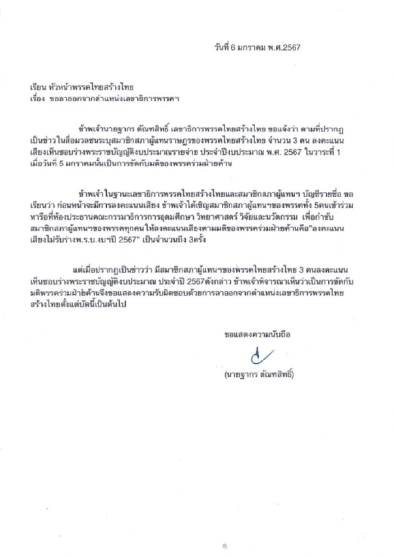 ล่าสุด วันที่ 6 มกราคม 67 ผู้สื่อข่าวรายงานว่า นายฐากร ตัณฑสิทธิ์ ส.ส.บัญชีรายชื่อ พรรคไทยสร้างไทย ทำหนังสือถึง คุณหญิงสุดารัตน์ เกยุราพันธุ์ หัวหน้าพรรคไทยสร้างไทย ขอลาออกจากตำแหน่งเลขาธิการพรรคไทยสร้างไทย เวันที่ 6 มกราคม โดยระบุมีข่าวปรากฎในสื่อมวลชนว่า สมาชิกสภาผู้แทนราษฎรของพรรคไทยสร้างไทย จำนวน 3 คน ลงคะแนนเสียงเห็นชอบร่างพระราชบัญญัติงบประมาณรายจ่าย ประจำปีงบประมาณ พ.ศ. 2567 ในวาระที่ 1 เมื่อวันที่ 5 มกราคมนั้นเป็นการขัดกับมติของพรรคร่วมฝ่ายค้าน ในฐานะเลขาธิการพรรคไทยสร้างไทยจึงขอแสดงความรับผิดชอบ