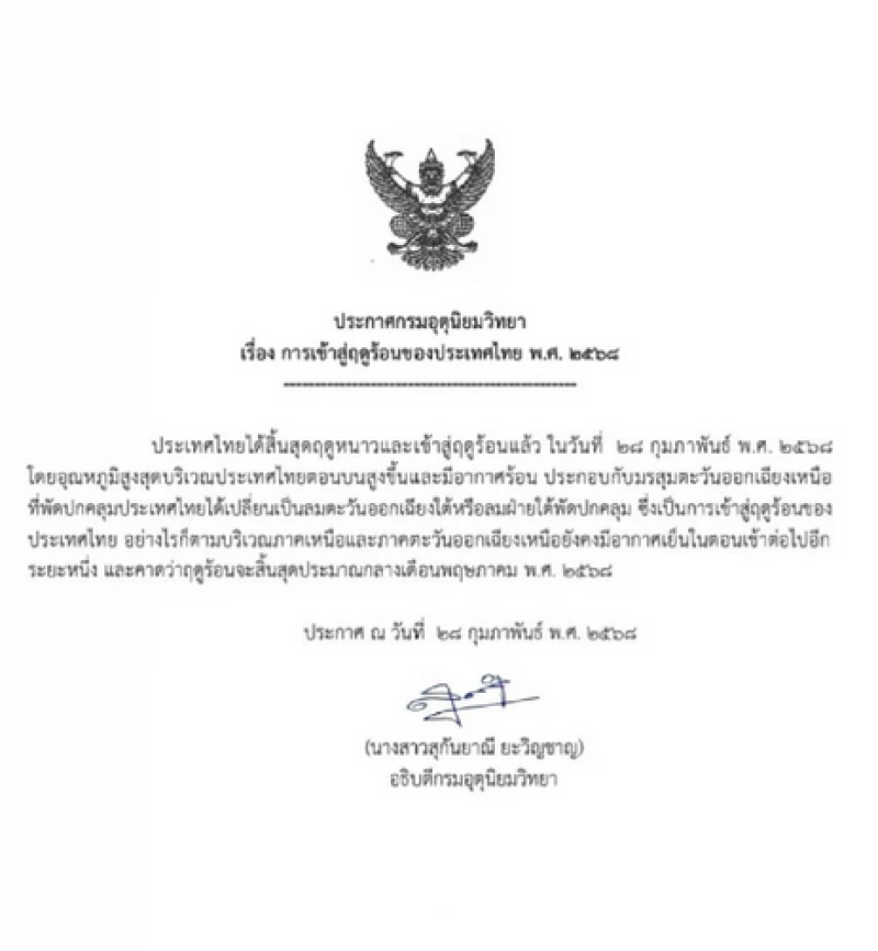 กรมอุตุนิยมวิทยา ประกาศ ประเทศไทยสิ้นสุดฤดูหนาว เข้าสู่ฤดูร้อนอย่างเป็นทางการ โดยมีเนื้อหาระบุว่า.. "ประกาศเริ่มต้นฤดูร้อน ปี พ.ศ. 2568 ประเทศไทยได้สิ้นสุดฤดูหนาวและเข้าสู่ฤดูร้อนแล้ว ในวันที่ 28 กุมภาพันธ์ พ.ศ. 2568 โดยอุณหภูมิสูงสุดบริเวณประเทศไทยตอนบนสูงขึ้นและมีอากาศร้อน
