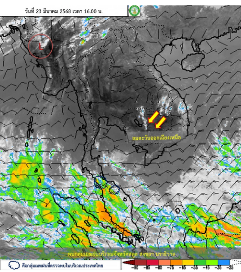 23 มี.ค. 2568 กรมอุตุนิยมวิทยา พยากรณ์อากาศ 24 ชั่วโมงข้างหน้า หย่อมความกดอากาศต่ำ เนื่องจากความร้อนปกคลุมภาคเหนือ ในขณะที่บริเวณความกดอากาศสูงหรือมวลอากาศเย็น ที่ปกคลุมประเทศไทยตอนบนมีกำลังอ่อนลง