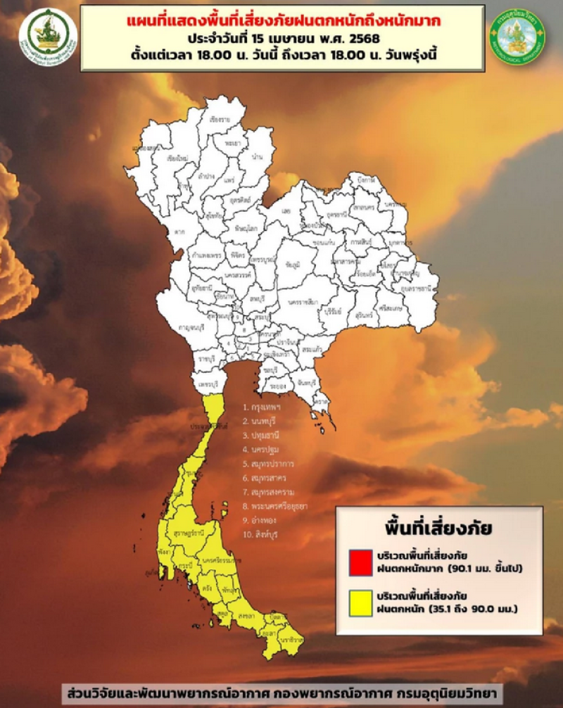 15 เม.ย. 2568 กรมอุตุนิยมวิทยา พยากรณ์อากาศ 24 ชั่วโมงข้างหน้า ประเทศไทยตอนบนจะมีอุณหภูมิสูงขึ้น กับมีอากาศร้อนโดยทั่วไปในภาคตะวันออกเฉียงเหนือ ภาคกลาง รวมทั้งกรุงเทพมหานครและปริมณฑล โดยยังคงมีฝนฟ้าคะนอง และลมกระโชกแรงบางแห่ง รวมถึงอาจมีฟ้าผ่าเกิดขึ้นได้บางพื้นที่บริเวณภาคเหนือ ภาคกลาง รวมทั้งกรุงเทพมหานครและปริมณฑล และภาคตะวันออก
