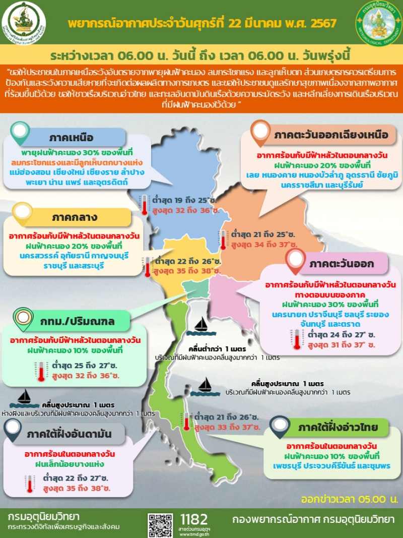22 มีนาคม 2567 พยากรณ์อากาศ 24 ชั่วโมงข้างหน้า คลื่นกระแสลมฝ่ายตะวันตกจากประเทศเมียนมาเคลื่อนเข้าปกคลุมภาคเหนือ และประเทศลาวตอนบน ลักษณะเช่นนี้ทำให้ภาคเหนือมีพายุฝนฟ้าคะนอง กับมีลมกระโชกแรง และมีลูกเห็บตกบางแห่ง ประกอบกับมีลมใต้และลมตะวันออกเฉียงใต้พัดปกคลุมภาคตะวันออกเฉียงเหนือตอนล่าง ภาคกลางตอนล่าง และภาคตะวันออก ลักษณะเช่นนี้ทำให้บริเวณดังกล่าวมีฝนฟ้าคะนองเกิดขึ้นได้บางพื้นที่ ขอให้ประชาชนในภาคเหนือระวังอันตรายจากพายุฝนฟ้าคะนอง ลมกระโชกแรง และลูกเห็บตก ส่วนเกษตรกรควรเตรียมการป้องกันและระวังความเสียหายที่จะเกิดต่อผลผลิตทางการเกษตร ในขณะที่ความกดอากาศต่ำเนื่องจากความร้อนปกคลุมประเทศไทยตอนบน ลักษณะเช่นนี้ทำให้บริเวณดังกล่าวมีอากาศร้อนกับมีฟ้าหลัวในตอนกลางวัน ขอให้ประชาชนดูแลรักษาสุขภาพเนื่องจากสภาพอากาศที่ร้อนขึ้นไว้ด้วย
