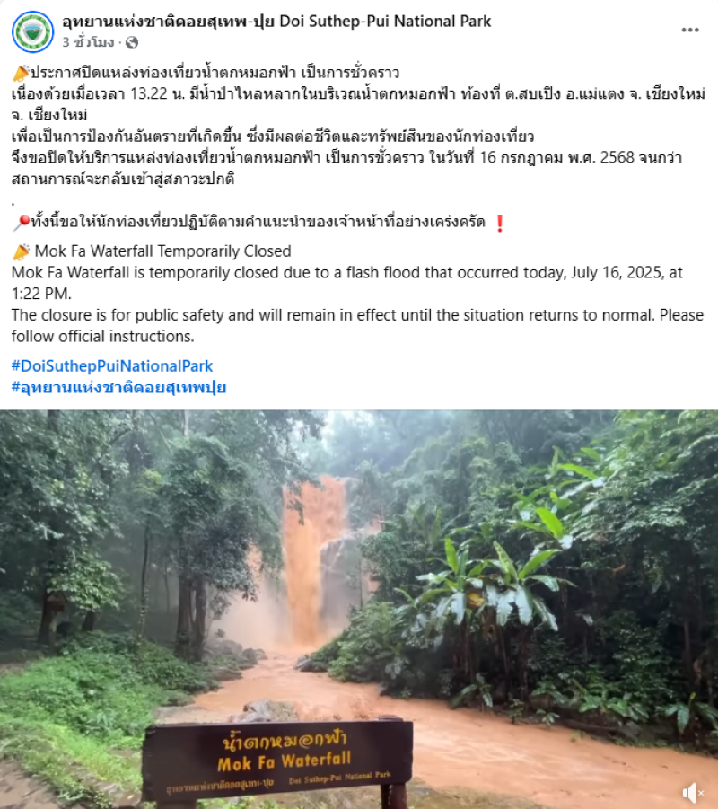 16 ก.ค. 68 อุทยานแห่งชาติดอยสุเทพปุย ได้ประกาศปิดแหล่งท่องเที่ยวน้ำตกหมอกฟ้า เป็นการชั่วคราว