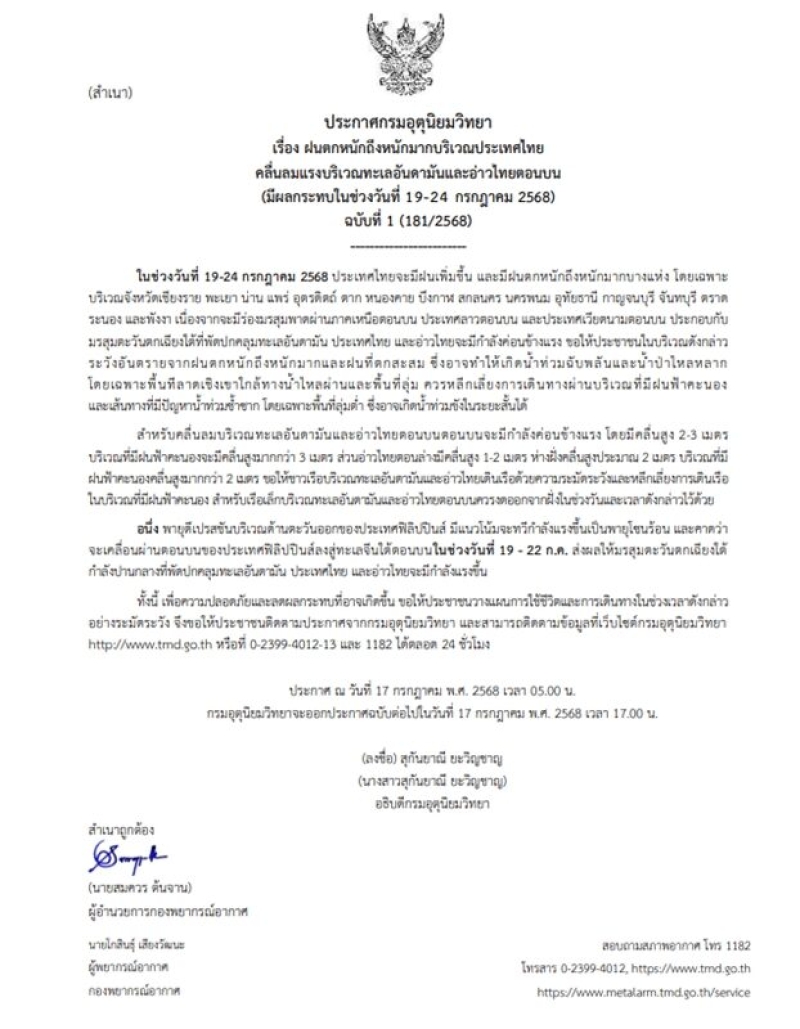 เมื่อวันที่ 17 กรกฎาคม 2568 กรมอุตุนิยมวิทยา ได้ออกประกาศฉบับที่ 1 (181/2568) แจ้งเตือนเรื่อง ฝนตกหนักถึงหนักมาก ในหลายพื้นที่ของประเทศไทย พร้อมเตือนภัย คลื่นลมแรง บริเวณทะเลอันดามันและอ่าวไทยตอนบน ซึ่งจะส่งผลกระทบในช่วง วันที่ 19-24 กรกฎาคม 2568