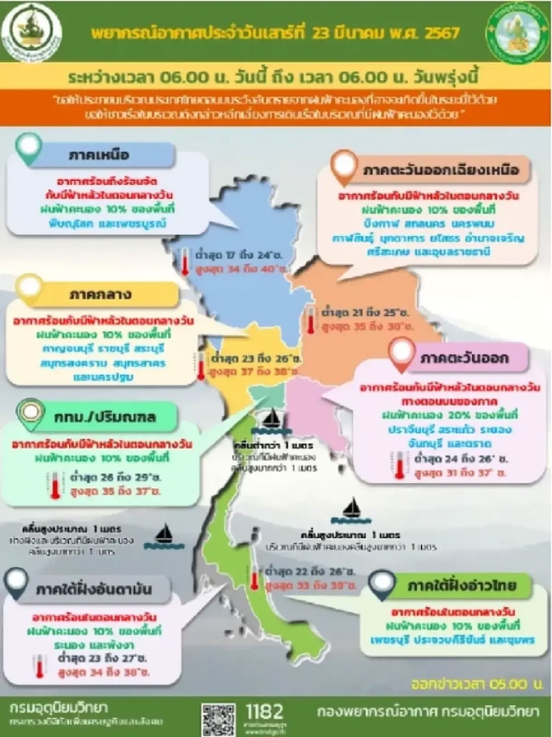 วันที่ 23 มีนาคม 2567 ความกดอากาศต่ำเนื่องจากความร้อนปกคลุมประเทศไทยตอนบน ลักษณะเช่นนี้ทำให้บริเวณดังกล่าวมีอากาศร้อนกับมีฟ้าหลัวในตอนกลางวัน ขอให้ประชาชนดูแลรักษาสุขภาพเนื่องจากสภาพอากาศที่ร้อนขึ้นไว้ด้วย ในขณะที่มีลมใต้และลมตะวันออกเฉียงใต้พัดนำความชื้นจากอ่าวไทยและทะเลจีนใต้เข้ามาปกคลุมภาคตะวันออกเฉียงเหนือตอนล่าง ภาคกลางตอนล่าง และภาคตะวันออก
