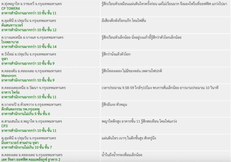 ในบางจุด เช่น อาคารในย่านถนนบรรทัดทอง รายงานว่ารู้สึกเหมือนตึกโยกเล็กน้อย ขณะที่อาคารสูงกว่า 10 ชั้นในเขตราชเทวี หลายคนรู้สึกเวียนศีรษะ และสังเกตเห็นไฟรางหรือโคมไฟภายในสำนักงานแกว่งไปมา