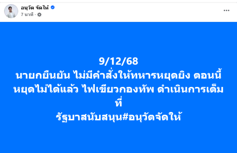 จากสถานการณ์ชายแดนไทย-กัมพูชา ที่กำลังเดือดกันอย่างต่อเนื่อง ล่าสุดวันนี้ 9 ธ.ค. 68 ได้มีข่าวออกมาว่านายกมีการสั่งให้หยุดยิง ล่าสุด อนุวัต ได้ออกมาโพสต์ว่า นายกยืนยัน ไม่มีคำสั่งให้ทหารหยุดยิง