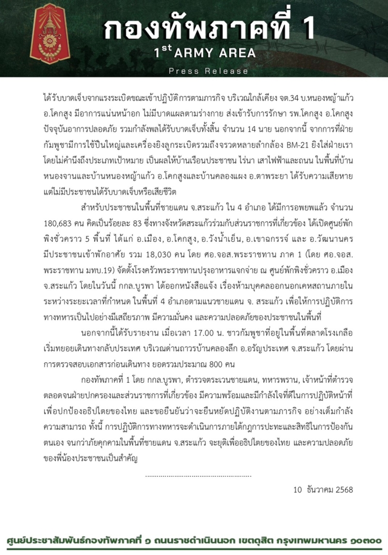 ศูนย์ปฏิบัติการกองทัพภาคที่ 1 สรุปสถานการณ์ชายแดนไทย-กัมพูชา พื้นที่ จ.สระแก้ว ประจำวัน 10 ธันวาคม 2568 เวลา 18.00 น. กกล.บูรพา ปฏิบัติภารกิจปกป้องอธิปไตยในสถานการณ์ความขัดแย้งไทย-กัมพูชา ในปัจจุบัน เป็นวันที่ 3 โดยมีการปฏิบัติใน 5 พื้นที่ ดังนี้